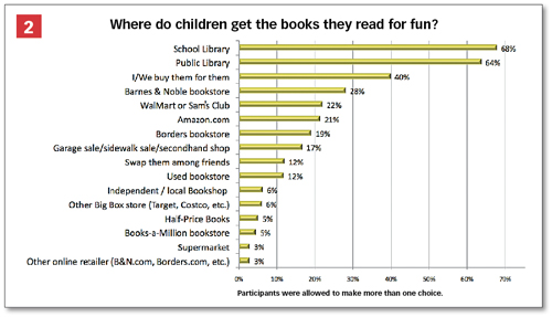 However, when it comes to buying books to read for fun, bookstores tumbled to the bottom of the chart, with independents slightly edging out Target/Costco. (See chart #2.) School libraries and public libraries topped the list, with Barnes & Noble being the favorite bookstore, followed by Wal-Mart, Amazon, and Borders, which are separated by only a few percentage points. In the survey, independents captured a smaller share of the market, 6%, than they do for bookselling overall. The skewed results may reflect the fact that respondents made multiple selections.
