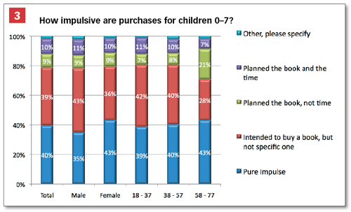 In her presentation, McLean encouraged independent booksellers to take heart. "It's not as bad as you think," she said. "Seeing a book matters. They don't come in to buy a book. They're buying a book they see." Added Gallagher: "A lot of purchasing habits are common across the board." Close to 80% of book purchases are not planned, and of those, 40% are pure impulse—double that for adult titles. (See chart #3.)