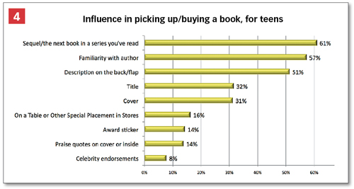 For teen readers, celebrity endorsements, cover and flap blurbs, and awards have little influence on picking a book. (See chart #4.) Sequels are the most popular factor, followed by familiarity with author, and back and flap copy. The whole package counts, with the title and cover each affecting nearly one third of selections.